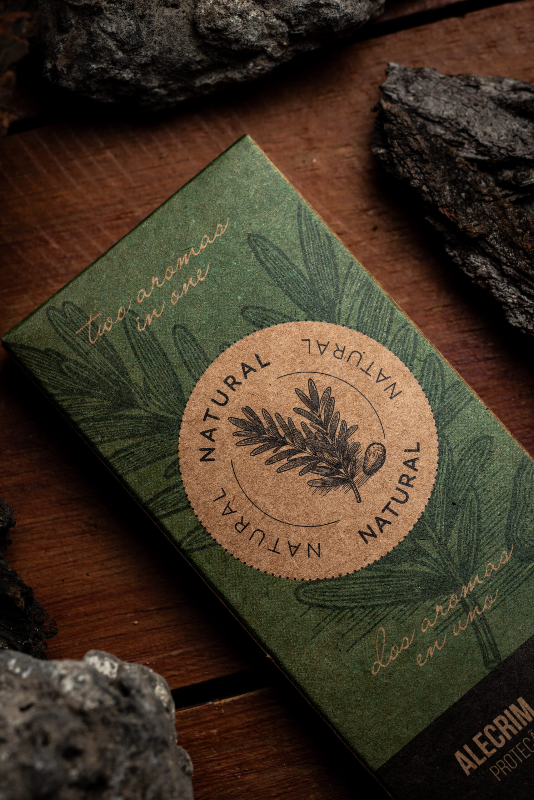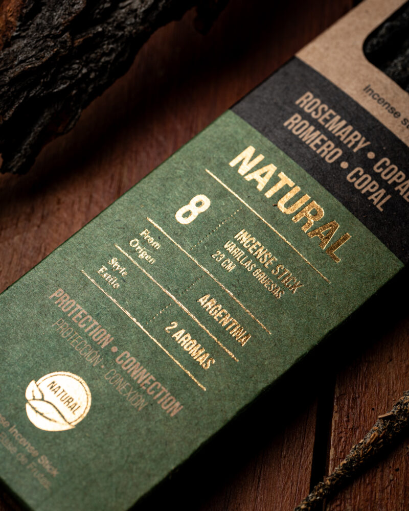 Resina de copal, romero seco, biomasa de fruta, carbón vegetal, aglutinante natural y sal